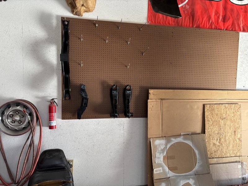 My shop walls are plywood painted white. Used pegboard years ago but man, it ends up being home for spiders etc so I got rid of it all. The plywood is 3/8ths inch thick so it'll take nails or screw hooks. Galvanized finishing nails work well and they don't leave a hole large enough for any 8 legged critters when removed. Besides, most of the nails are still in place and holding all kinds of parts....and might hang the only rallye wheel 'center' that's still here. Don't think I have a center cap for it though....Added some peg board in the garage to organize finished parts before they go on the car.