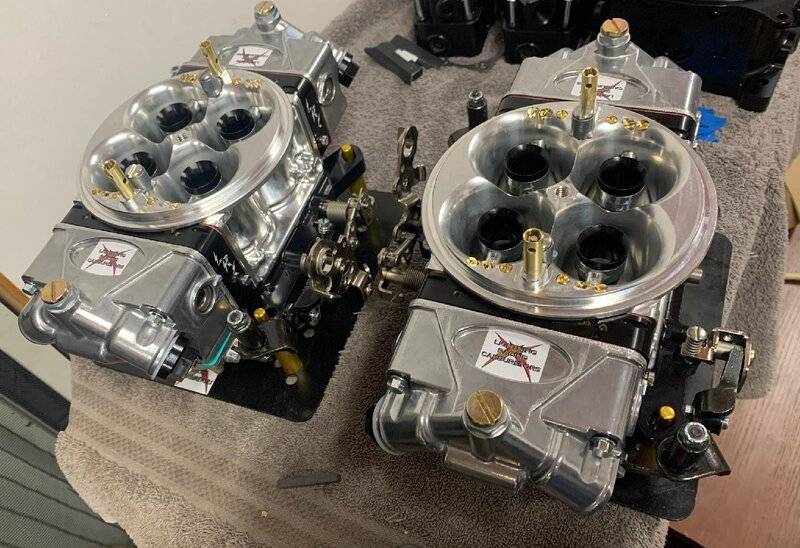 home made carbon fiber hood and scoop from a buddy of mine. He brought it today. Not super light but lighter than my AAR. 19.5# w/scoop vs 37#. I need to trim around the rear pins so itll set flat. But fits nice. Good gaps and straight. Also new 4150 style carbs from Mark Whitener at Lightning carbs. They are in transit as well. Eddys are going on the shelf.