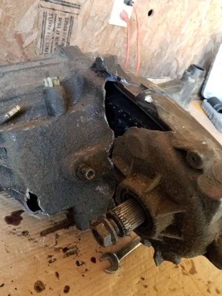 This is in a truck he just picked up. The bolts came out of the driveshaft and it caught the transfer case and locked up blowing both case halves (just started moving from a stop). There was one bolt left in the flange and it was half out and bent. Found some used case halves and will be putting a new chain and bearings in. Rebuild it myself.