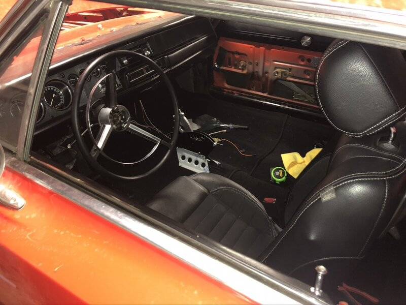 I have to have the engine bay repainted on the Duster- I don't know how to properly prep or paint, it has a black engine bay, the car is blue, for me easier to repaint with black, but the engine bays painted same as exterior look so right. I'd be willing to pay up to a $100.00 for someone to do it which means I'll be doing it myself, it'sgoing to be ugly.Finally got the steering wheel and driver's seat in so I could position the shifter.