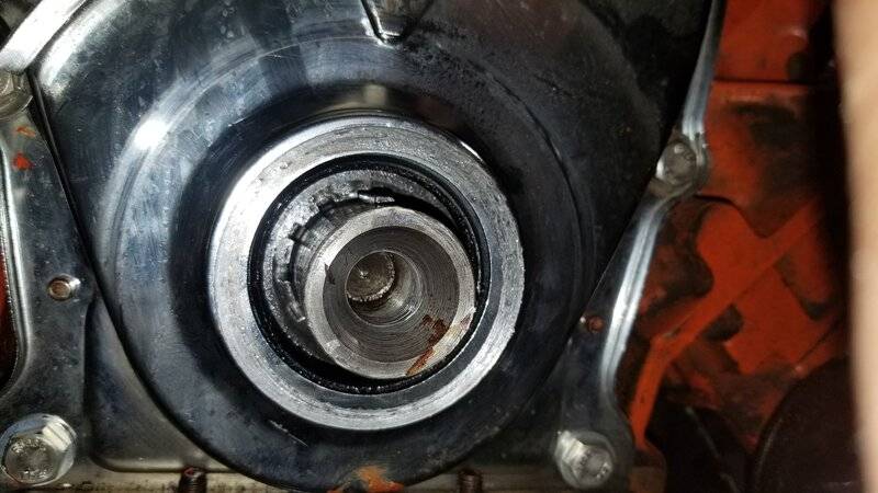 I believe the rubber smashed into the raised area on the timing cover and caused the crumbled look. The worst part of the rubber is where the “crusty” part of the outer ring is wore off. The seal lip is also wore down rough from where I had the too long bolt in it.