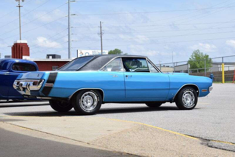 I honestly think the opposite. Maybe it’s the photo or the tire height or something, but it looks way better (to me) in the top photo.I know that some people get tired of seeing the Rallye wheels on everything but come on… that blue Duster looks so much better with them compared to the hub caps.