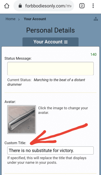 Well thank you kindly sir!Go to your Personal Details and open Your Account. Several fields will be displayed...one of which is "Custom Title". Here is what mine looks like: