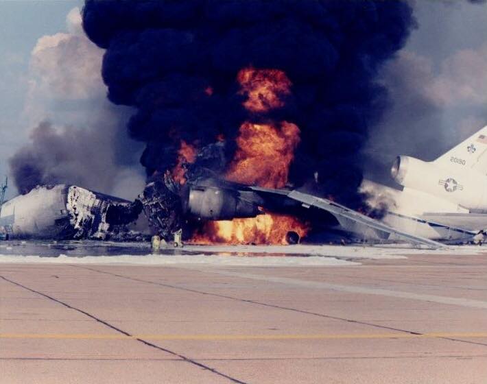This happened 31 years ago today. One Airman died who was onboard way in the back. I was there when it happened in a building about 200 yards away. A very Big bang!