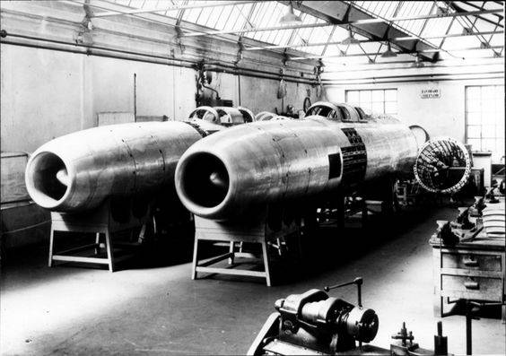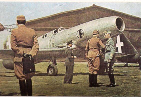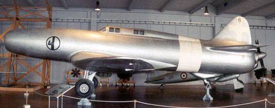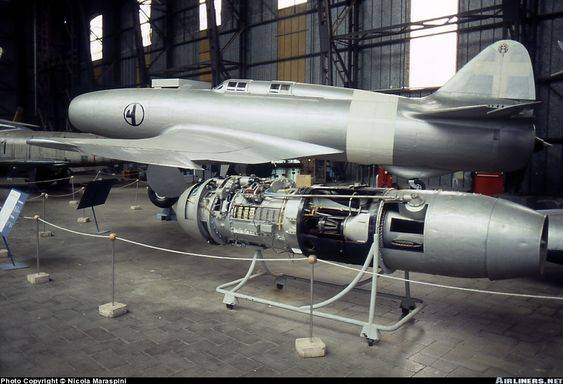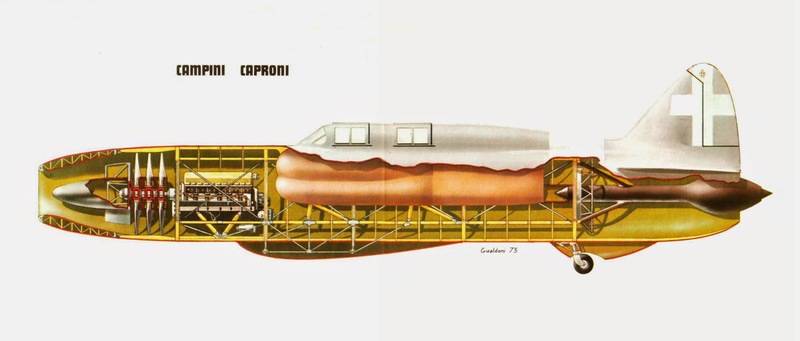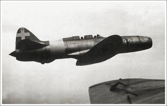 If you look closely at those Caproni pictures, you can see in the bottom one how the plane is powered by a motorjet; a 900 hp. piston engine drives the front compressor blades before the compressed air is channeled to the afterburner combustion chamber. In actual testing, this engine/fan arrangement provided enough thrust to fly the plane without even using the rear chamber. In the third picture, you'll see the plane in flight with the canopies open. This engine heated the cockpits too much to fly fully enclosed.