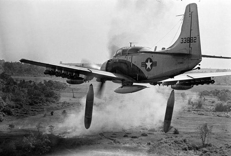 An A-1 Skyraider flies low over the jungle and drops 500-pound bombs on a Viet Cong position below, December 26, 1964.