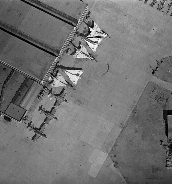Arrows 25202, 25205, 25201, 25204 and 25203 (from top to bottom) await their fate outside Avro Canada’s experimental building in Malton, Ontario, May 8, 1959. Three straight-winged Avro Canada CF-100 Canuck jet interceptors, the aircraft type that the Arrow was meant to replace, are parked alongside the Arrows. (e999911909)