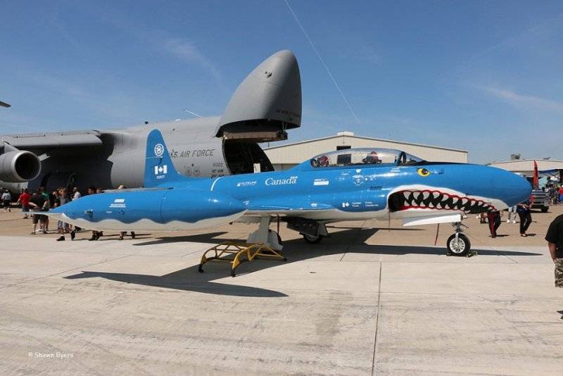 I think that was one of our Canadair CT-133 trainers, squadron VU-32 was disbanded in 1992 so the photo is likely at least that old. That model was the Canadian built version of the Lockheed T-33, different from the Lockheed version in that it used a Rolls Royce Nene engine instead of the American Allison.