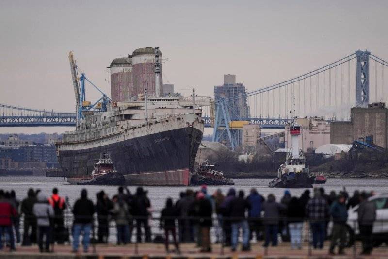 The SS United States is towed down the Delaware River between Pennsylvania and New Jersey, from Philadelphia, Wednesday, Feb. 19, 2025.