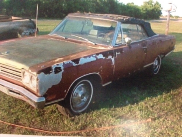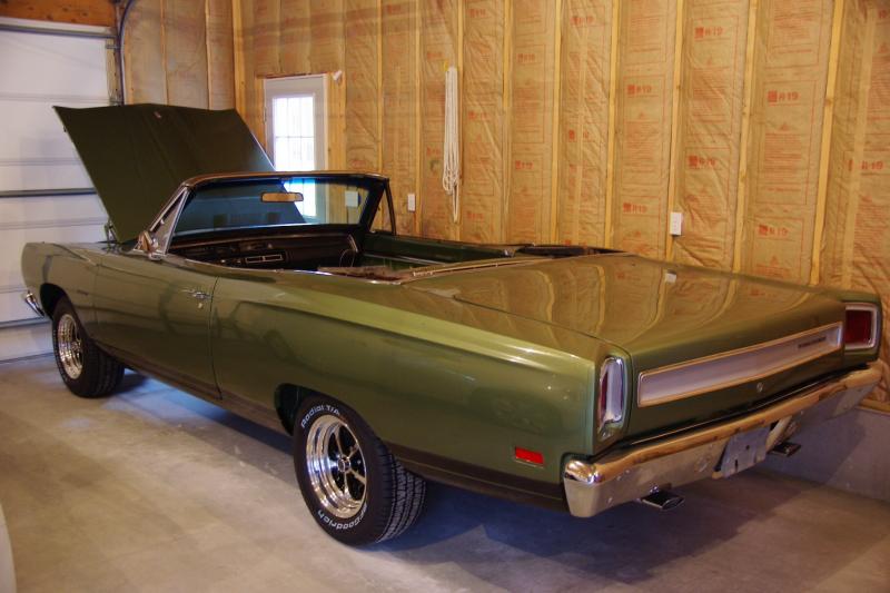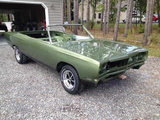 P.S. I put it back to the original color..F5..and added the GTX black on the bottom with a .25" F5 pinstripe that is just below where the Satellite trim will go. The car came with a Bronze/Saddle interior which I am changing to black and white with a black convertible top which is the original color. This is also a numbers matching car with power brakes/steering, A/C and cruise control, 83,000 original miles.