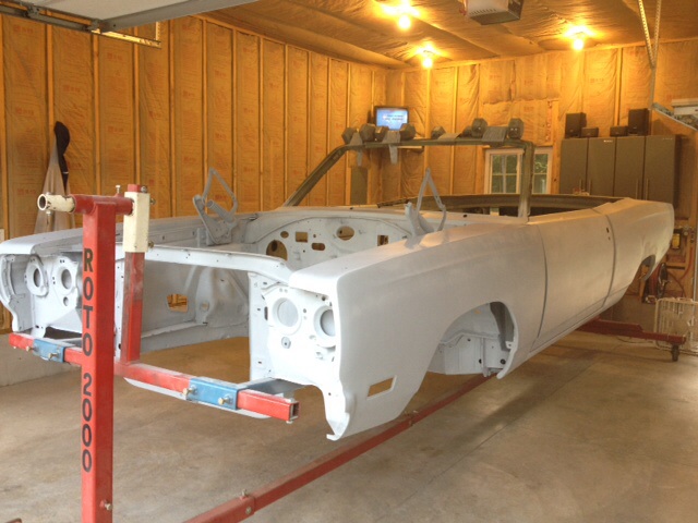 I bought this car 10 years ago, immediately dismantled and media blasted (car was painted twice over original paint and had to remove very old and hard original undercoating) and replaced the rear qtr's due to damage, car was solid from Oklahoma, did all this the first year then it sat. Started again on it 1.5 years ago, finally happy with how straight it was I painted it this past fall. Suspension, glass, weatherstripping are in. Ordered all interior soft goods and convertible top from Lengendary Auto Interiors before Christmas, that's when they run their sale, plus I live a half hour away from them. Should have in a couple weeks, so I will be working on that the next couple months. 383 is tore down, will take to the machine shop around March, hoping to have it done by July 2014 in time for the Syracuse Nationals.