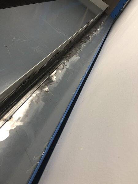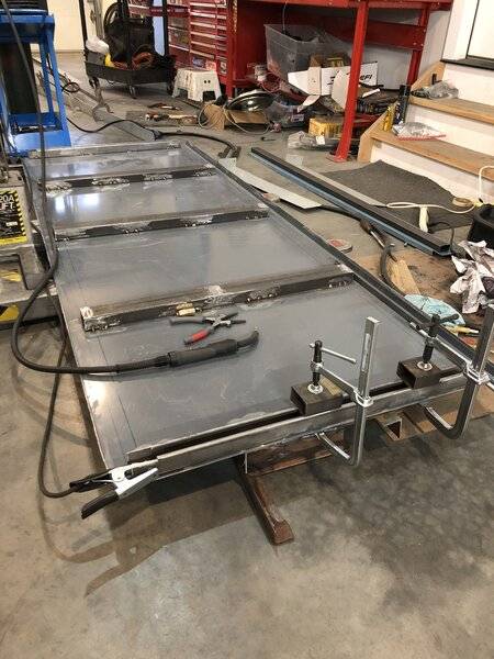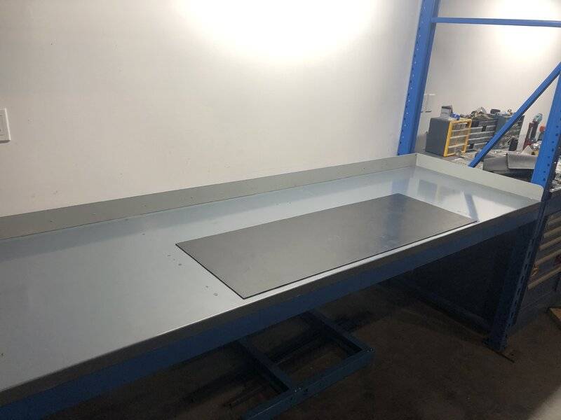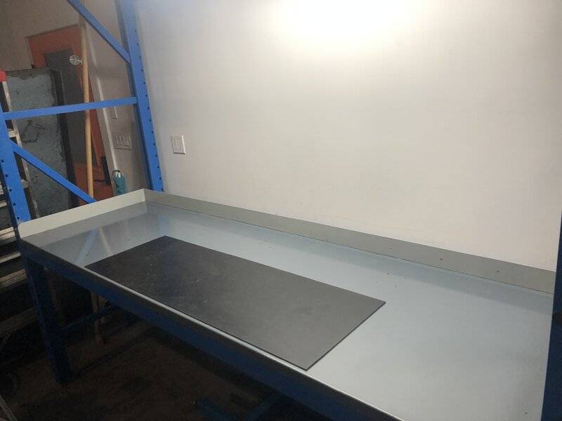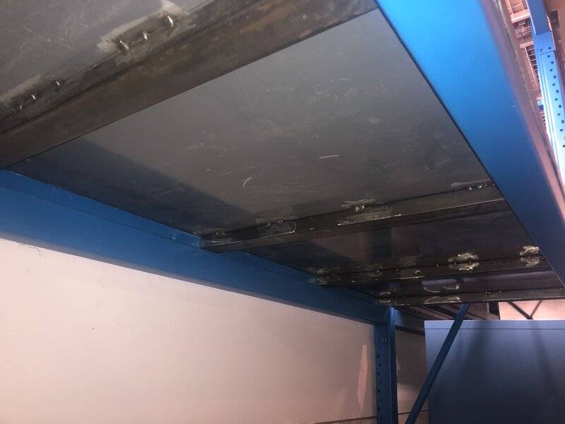 Since it was unsupported underneath the table was pretty flimsy. It was also really loud and noisy when you put something down on it. So that was all fixed by welding 1" x 2" square tubing and strut channel supports underneath. The ends of the supports rest on the pallet rack beam shelves. Worked out pretty well.