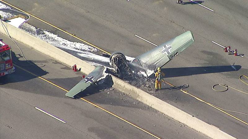 "This WW2 German marked SNJ-5 made an emergency landing on the 101 Freeway in the Western San Fernando Valley yesterday.