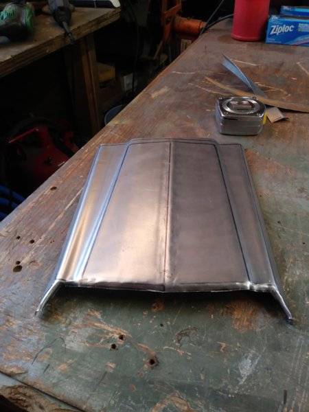 I think it's doable. I'll need to go the my steel supply and convince them to allow me to use their 8ft brake. I also need to devise a way to get the rise down the center line, Maybe slice a "V" into the wood table top and carve a block out as the positive and tap on it to sink the center line into the "V"? If I only had a bead roller! Anyway, the fun parts will be the roll over at the nose across the front, the curved legs at the front corners down next to the hood surface and the rear vertical portion that faces the driver. I worked out a way to get the bolt down flanges to work by cutting slider slots in the flange and having a piece of aluminum with the bolts through it in a strip about 3/4" wide that can slide sideways with the bolt shanks sliding into the side of the slots and then slide the strip and the bolts backward into the slots, and tighten them down. So, I think I'll take a shot at it!! Also I think i'll tack thin rods onto the underside in three places going from left to right to keep it from flexing/sinking. With the first rod far enough behind the front lip to not be seen.