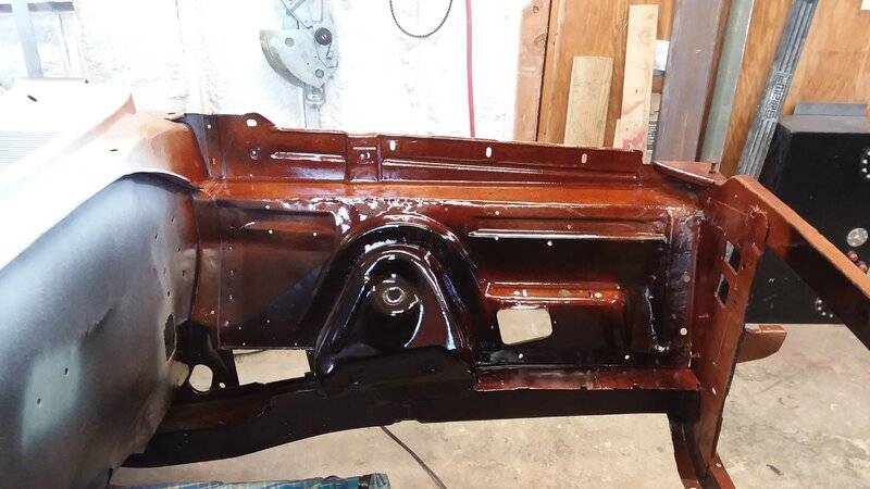 Well, I got some color on her today. Just enough to get the front end back under it so I can wheel it outside and use the garage to paint doors and hood and deck lid and small parts. I made a mistake of using a couple of different colors of primer. So parts are darker in spots but no worries because the close out panels will cover it all. THEY will be gray primer...lol. Lots of sparkle under the lights...