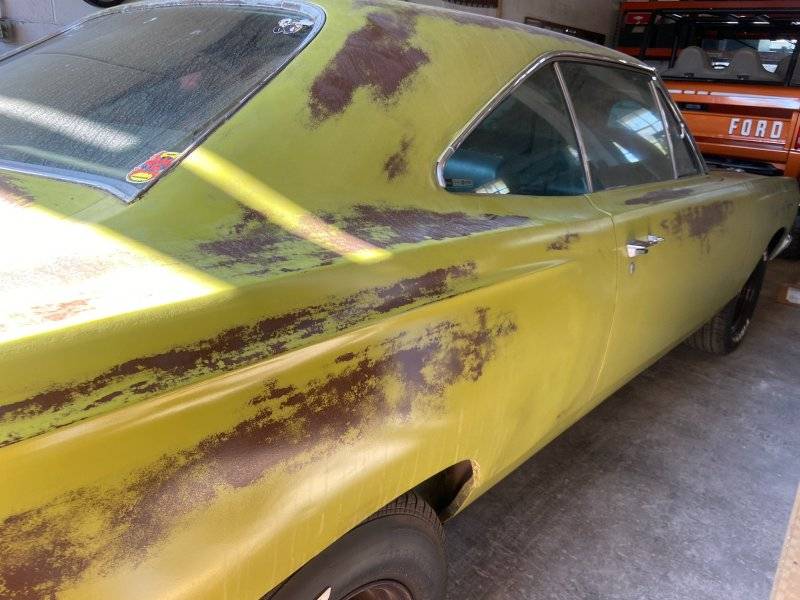 Thank you. The car was built F4 light green metallic, which has a slight lime-gold tint to it compared to the car now. It was repainted at some point (I'm guessing late 70s/early 80s, since it's still single-stage) with a cheap Earl Sheib spray, for some reason. I think there may be a hint of bondo over the drivers rear wheel - maybe they scraped a garage door or something. The panel inside the trunk is straight, so whatever it was, was more "scrape" than "dent". And, every panel is original - it all has the original paint on the backside, and all the original hardware.that's a great looking green. I would leave as-is as well. What color code green is that?